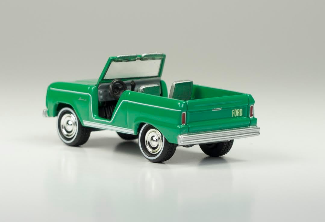 The green paint with white stripes on this Bronco was inspired by the magazine advertisement artwork that Ford Motor Company used to introduce the world to the all-new Bronco back in the summer of 1965. This vintage ad artwork is incorporated on the front and rear of the packaging to make this a unique Bronco 50th Anniversary commemorative collectible.